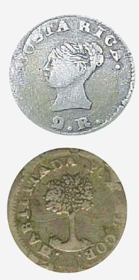 | En 1845 se resellan monedas españolas con el busto de perfil de una mujer joven que parece que fuera la reina Victoria de Inglaterra, en el anverso en la circunferencia esta leyenda "Costa Rica - 2 Rs" y en el reverso un árbol de café y alrededor "Habilitada por el Gob", con un diámetro de 13 mm .